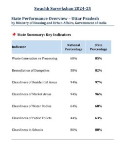 स्वच्छता सर्वेक्षण 2024 में उत्तर प्रदेश सभी महत्वपूर्ण मापदंडों पर राष्ट्रीय औसत से बेहतर प्रदर्शन करने वाला राज्य बनकर उभरा