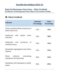प्रदेश के अनेक नगर निगम, नगर पालिकाएं और नगर पंचायतें इस वर्ष की रैंकिंग में पिछले वर्षों की तुलना में कई पायदान ऊपर पहुंची हैं। इस स्वच्छ सर्वेक्षण में एक और खास बात यह देखेंगे उत्तर प्रदेश सभी महत्वपूर्ण मापदंडों पर राष्ट्रीय औसत से बेहतर प्रदर्शन करने वाला राज्य बनकर उभरा और यह सब हुआ सिर्फ सरकारी आंकड़ों के आधार पर नहीं बल्कि नागरिकों के विचार एवं प्रमाण से भी। यह साफ़ संकेत है कि सुशासन, तकनीकी नवाचार और सामाजिक सहभागिता ने मिलकर उत्तर प्रदेश के शहरी क्षेत्रों में स्थायी स्वच्छता संस्कृति को जन्म दिया है।