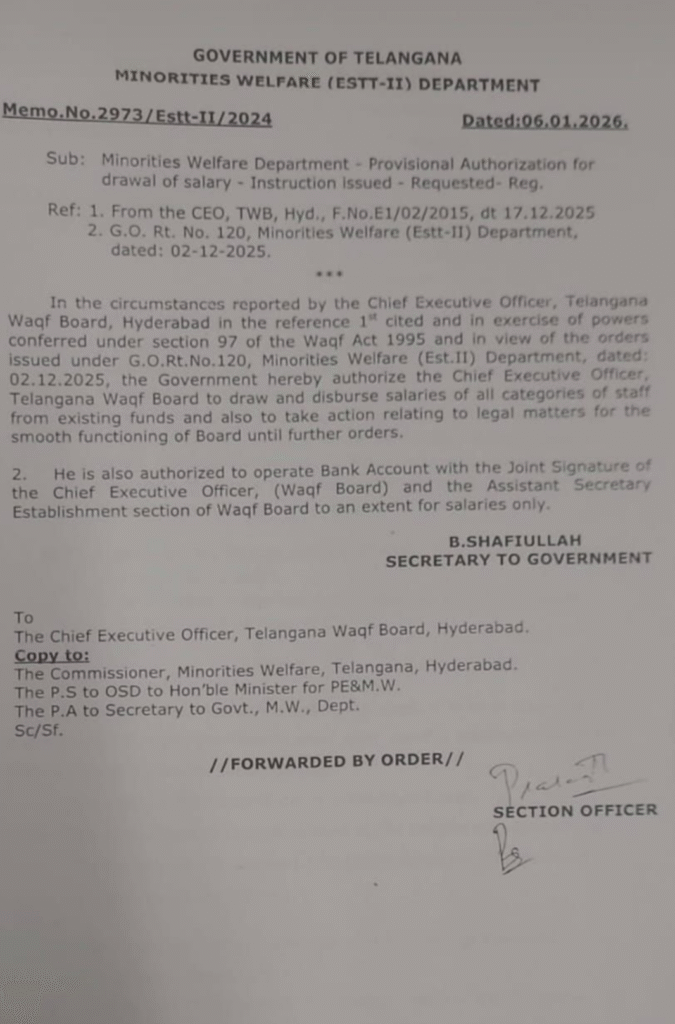 Hyderabad :It is well appreciated that Minorites Welfare Department , Govt of Telangana, has issued Memo dated 06.01.2026 authorizing the CEO of Telangana Waqf Board  to take action relating legal matters for the smooth functioning of the Board, among other financial matters too.  We call for its thorough implementation with full cooperation/support from the Chairman and staff of the TGWB. The  TGWB cannot be an arena for ego, power games, and corruption etc.