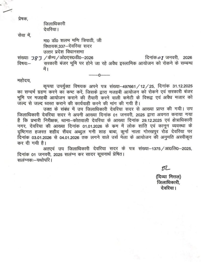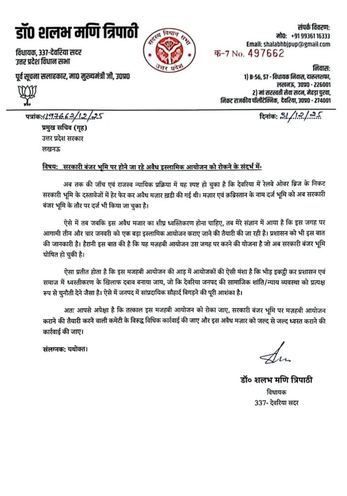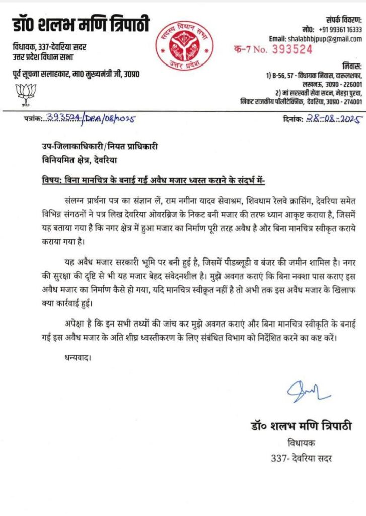 गौर तलब है कि शैलभ मणि त्रिपाठी,विधायक देवरिया के दिनांक 28.8.2025 लेटर लिख कर जिलाधिकारी से डिमोलिश करने के सिफारिश किया था।